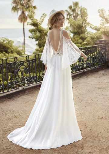 Model SOLAR je boho-romantický, jemný a přitom moderní. Šaty mají lehce áčkovou sukni z hebkého šifonu, který krásně splývá, a horní část s průsvitnou krajkou a netradičními rozevlátými rukávy s odhalenými rameny. Vzadu je hlubší výstřih do V, který působí smyslně, ale stále elegantně.