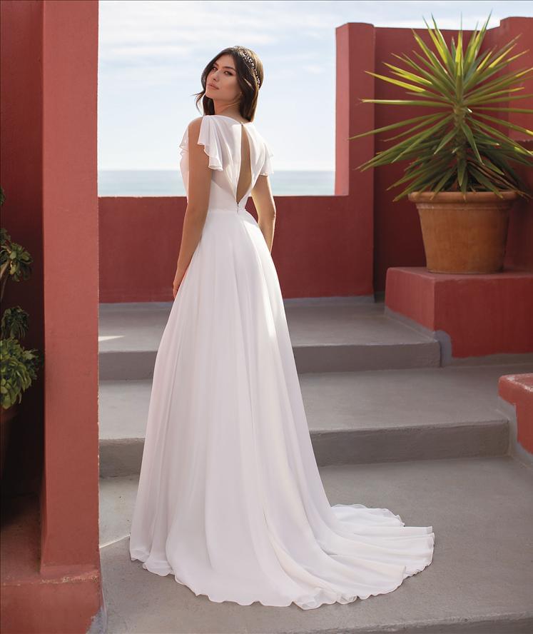 Svatební šaty SPRING působí lehce, svěže a přirozeně – jako stvořené pro letní svatbu u moře, v zahradě nebo pod širým nebem. Jemný živůtek s hlubokým výstřihem do V je změkčen splývavými šifonovými rukávky, které dodávají modelu romantický a vzdušný charakter.