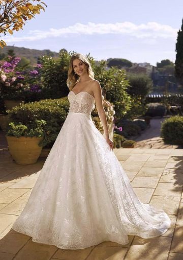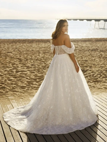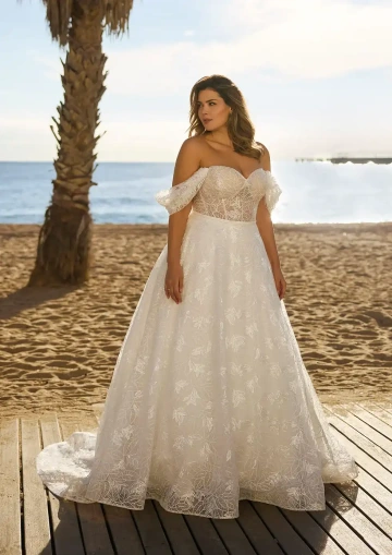 Éterické a současně výrazné svatební šaty STACY osloví nevěsty, které milují romantiku s dotekem originality. Korzet bez ramínek s jemným srdíčkovým výstřihem zaujme transparentním zpracováním a moderním listovým vzorem, který se opakuje po celé délce áčkové sukně. Odnímatelné nabírané rukávky dodávají modelu hravost a jemnost. Šaty jsou ideální volbou pro svatbu v přírodě, na statku i ve středomořském stylu.