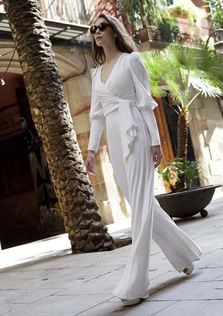 Nadčasová elegance v minimalistickém pojetí – overal VIM je určen pro sebevědomé nevěsty, které chtějí působit chic a zároveň přirozeně. Hladká silueta s hlubokým výstřihem do V vpředu i vzadu zvýrazňuje ženské linie a prodlužuje postavu.