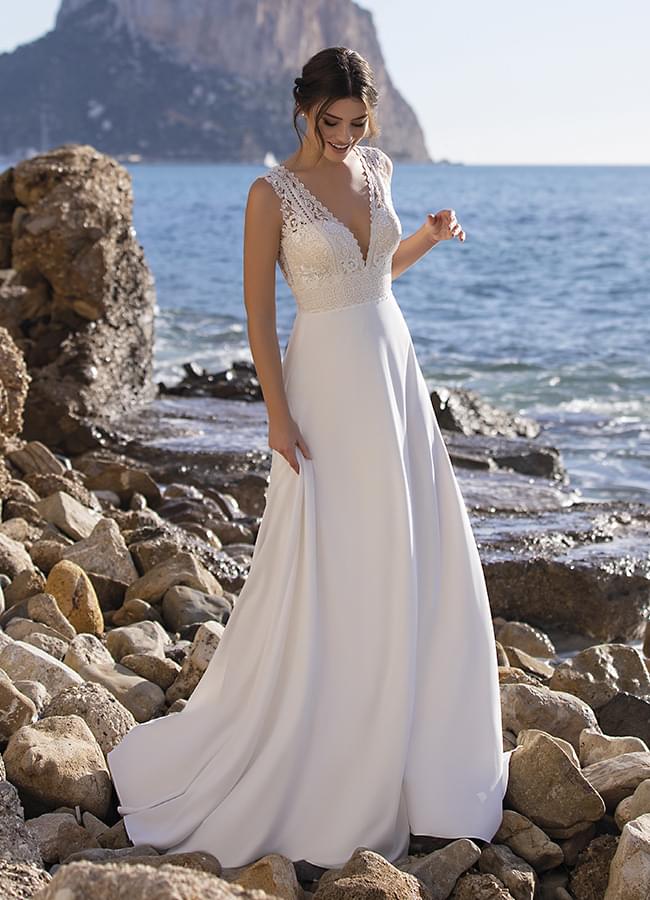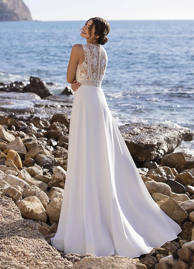 Lehké a přirozeně elegantní svatební šaty VINIE jsou ideální volbou pro nevěstu, která hledá nenucený půvab s jemně romantickým nádechem. Krajkový živůtek s hlubším výstřihem do V krásně tvaruje dekolt a plynule přechází do hladké, splývavé sukně, která se při chůzi jemně vlní. Průsvitná záda s bohatou krajkovou aplikací dodávají modelu ženskost a vzdušnost, aniž by působila příliš formálně. VINIE jsou perfektní volbou pro svatbu u moře, v přírodě i pro civilnější obřad s důrazem na lehkost a pohodlí.