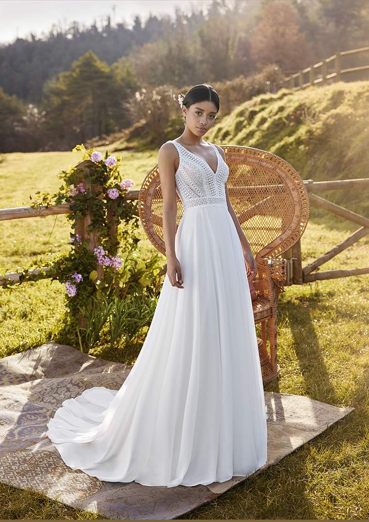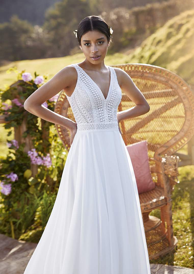 Svatební šaty YEU působí čistě, lehce a přitom moderně. Hladká šifonová sukně volně splývá až k zemi a krásně se pohybuje při každém kroku. Živůtek zdobený geometrickou krajkou vyniká hlubokým výstřihem do V a elegantně řešenými zády s originálním otvorem ve tvaru slzy. Perfektní volba pro nevěsty, které hledají jednoduchost s jemným boho nádechem.